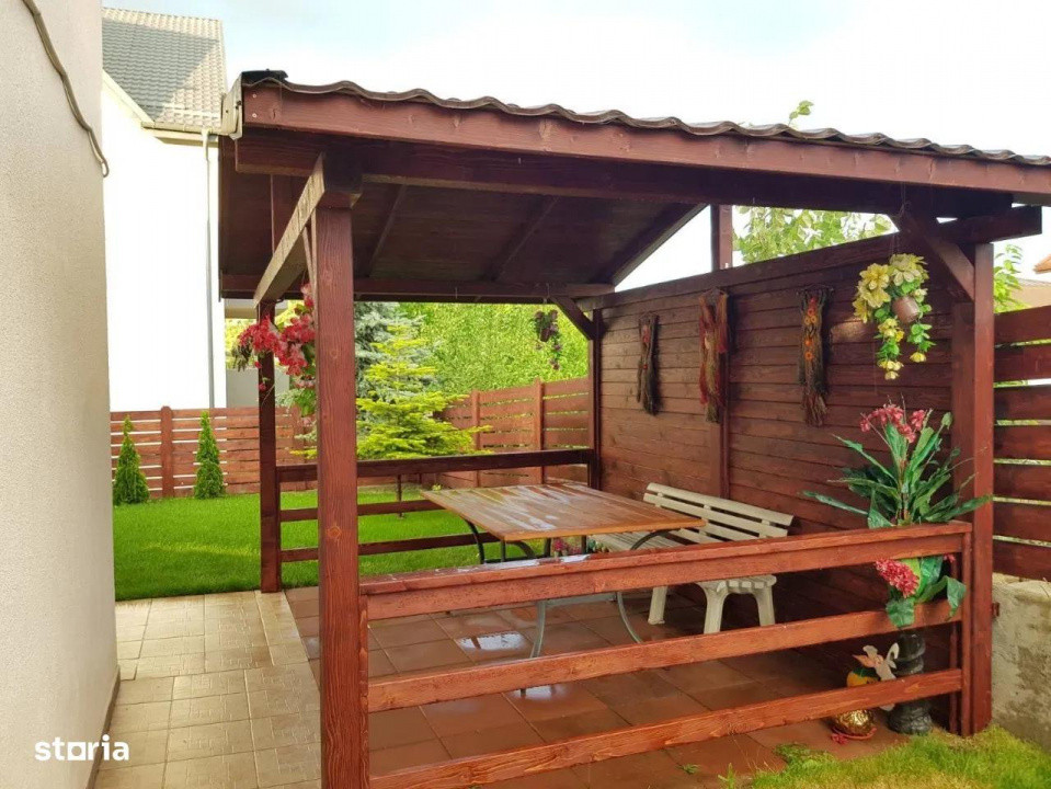 Curtea se bucura de gazon verde irigat automat cu aspersoare, foisor si magazie pentru depozitare și se vinde mobilata și utilată.