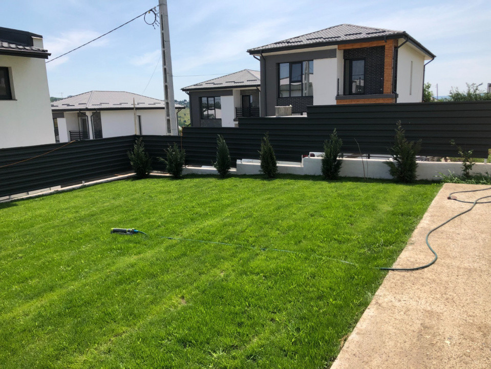 La exterior curtea este amenajată cu gazon și arbori ornamentali, zona de parcare auto amenajata, stradă privată, ideală pentru o familie care își dorește liniște, dar si apropiere de oraș.