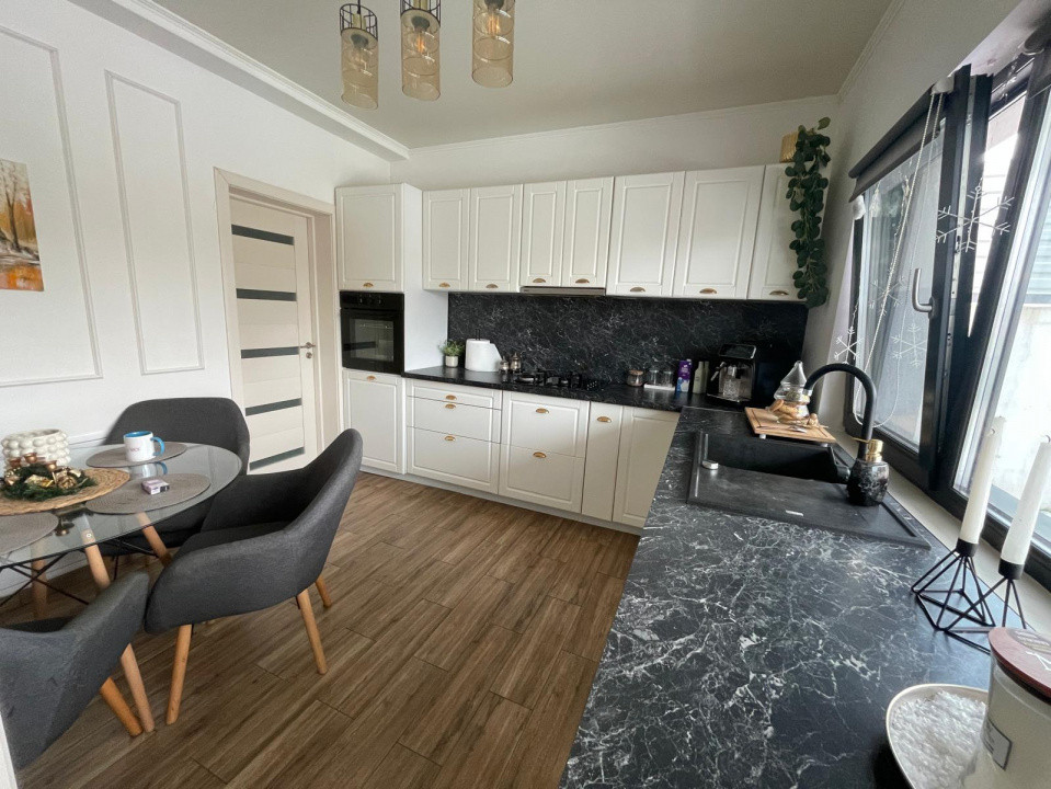 Compartimentarea este practică, gândită pentru o familie, cu spații bine proporționate și multă lumină naturală iar finisajele sunt moderne, alese pentru uz personal, nu pentru vânzare, parchet, gresie și faianță în stare excelentă, băi complet echipate, suprafețe vitrate mari, aparat aer conditionat 18.000 BTU in garantie, Incalzire in pardoseala parter+etaj, centrala prin condensare, izolatie acoperis spuma+vata bazaltica